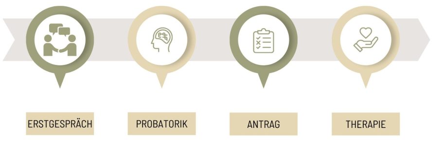 - Therapiephase: Die Sitzungen dauern üblicherweise 50 Minuten. Je nach Bedarf kann eine Akuttherapie (12 Sitzungen), eine Kurzzeit-(bis zu 2 x 12 Sitzungen) oder eine Langzeittherapie beantragt werden.